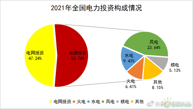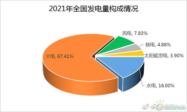 分类型看,2021年全国水电、火电、核电、风电、光伏发电的发电量分别为13401、56463、4075、6556和3270亿千瓦时,同比增速分别为-1.1%、9.1%、11.3%、40.5%和25.2%,分别占全国总发电量的16.00%、67.41%、4.86%、7.83%、3.90%。