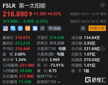 格隆汇4月24日丨第一太阳能(FSLR.US)盘前跌超2%,报211.89。花旗将第一太阳能的评级下调至“卖出”,称通胀削减法案的税收减免已完全定价。