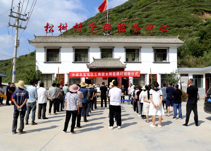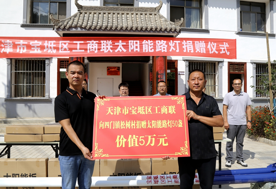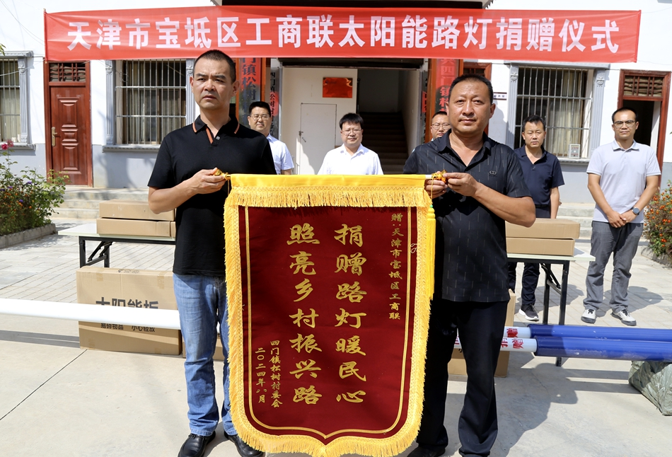 中宏网天津8月31日电 日前,天津市宝坻区工商联向武山县捐赠太阳能路灯仪式在武山县四门镇松树村举行,现场向松树村捐赠总价值5万元的太阳能路灯50盏,为村庄增添光明。松树村村委会向捐赠单位赠送了锦旗。