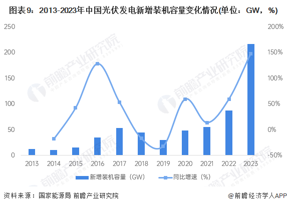 我国太阳能光伏行业虽起步较晚,但发展迅速,尤其是2013年以来,在国家及各地区的政策驱动下,太阳能光伏发电在我国呈现爆发式增长,据国家能源局统计数据显示,2017年,我国光伏发电新增装机容量为53.06GW,创历史新高,2018年,受光伏531新政影响,各地光伏发电新增项目有所下滑,全年新增装机容量为44.26GW,同比下降17%。受国家光伏行业补贴、金融扶持等政策影响,2020-2023年光伏装机量大幅回升。2023年光伏新增装机容量216.30GW,同比增长147%。其中集中式光伏电站12001.4万千瓦,分布式光伏9628.6万千瓦;而分布式光伏中户用光伏装机达到4348.3万千瓦。