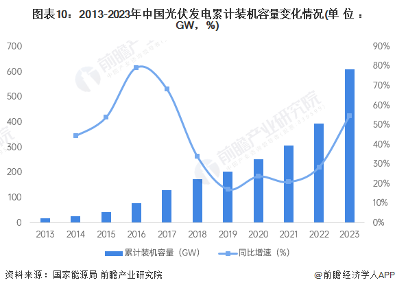 国家能源局统计数据显示,2013年以来,我国光伏发电累计装机容量增长迅速。2013年,全国光伏发电累计装机容量仅为19.42GW,到2019年已经增长至204.58GW。在2013-2019年,全国光伏发电累计装机容量已超过10倍增长。2023年,全国光伏发电累计装机608.92GW,同比增长55%。