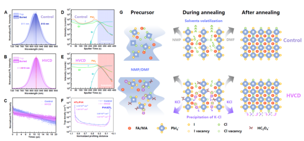 在这项研究中,科研人员发现,在传统工艺中,甲基氯化铵中的氯离子在薄膜结晶过程中会向上表面迁移并富集,导致钙钛矿层在垂直方向上氯元素分布不均。这种不均匀性会引发表面缺陷和界面电子势垒,增加载流子复合,影响电池性能与长期稳定性。