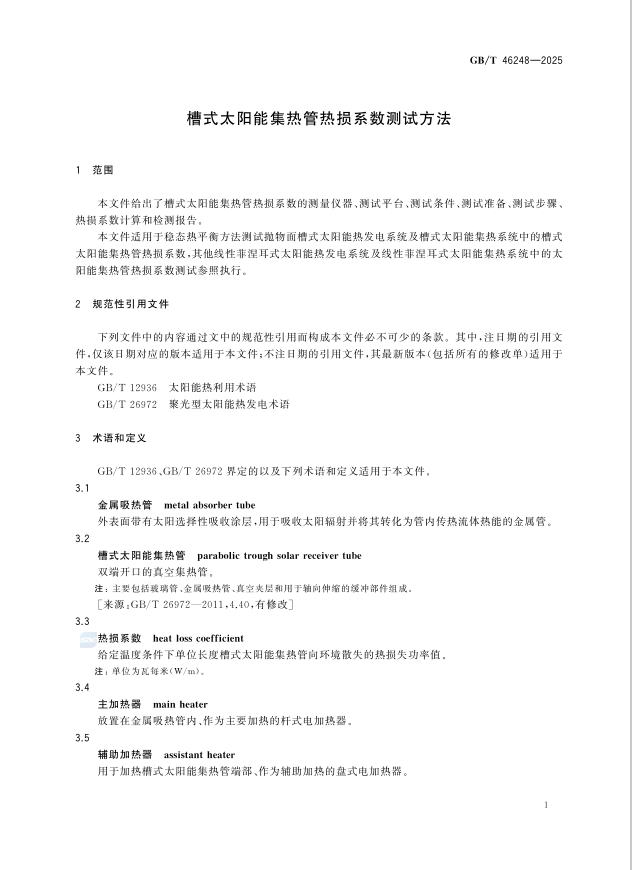 国家标准《槽式太阳能集热管热损系数测试方法》,编号GB/T 46248-2025,由全国太阳能光热发电标准化技术委员会归口,自2026年3月1日起实施。