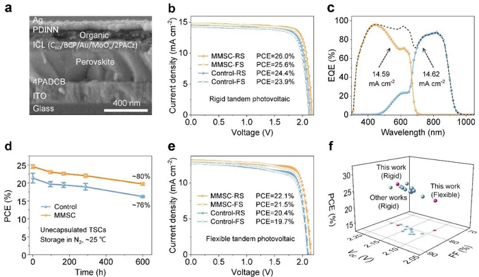 研究团队创新性地引入多功能分子添加剂——DL - 蛋氨酸甲基锍氯化物,通过其独特的官能团协同调控钙钛矿的结晶热力学与缺陷态。实验与理论计算表明,该添加剂不仅可以优化成核动力学、促进形成均匀致密的高质量薄膜,还可同步钝化体相与界面缺陷,显著抑制非辐射复合与相分离。基于此策略,团队成功制备出高质量带隙大于 1.8 eV的宽禁带钙钛矿材料薄膜,相应单结太阳能电池效率提升至20.4%,且稳定性显著增强。进一步,以此构建的钙钛矿/有机叠层电池实现了26.0%(刚性)与22.1%(柔性)的效率突破,展现出在柔性及可穿戴能源领域的应用潜力。