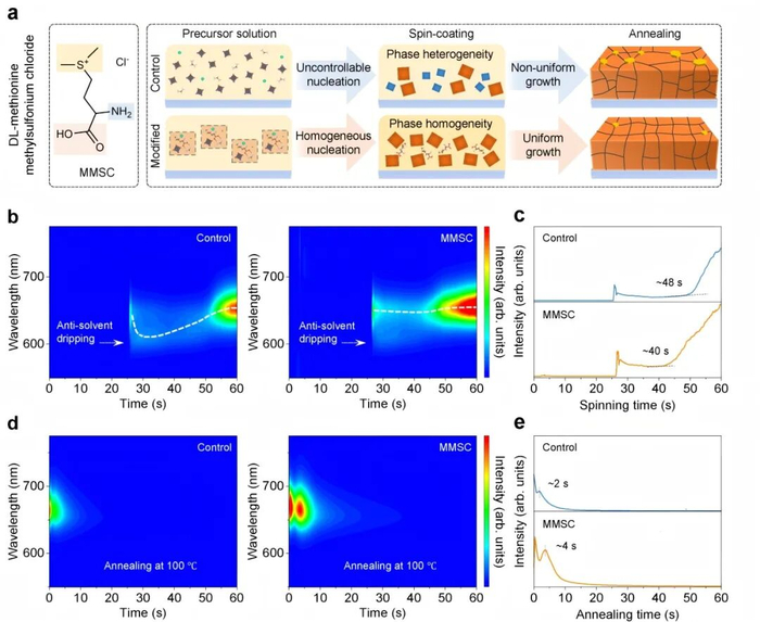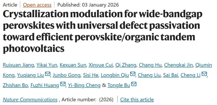 近日,厦门大学&厦门市未来显示技术研究院李澄教授联合武汉理工大学卜童乐研究员、黄福志教授、南方科技大学丘龙斌教授以及青岛大学刘玉强教授在宽禁带钙钛矿太阳能电池及叠层器件研究方面取得突破性进展。相关成果以“Crystallization modulation for wide-bandgap perovskites with universal defect passivation toward efficient perovskite/organic tandem photovoltaics”为题,发表于《Nature Communications》。该研究通过引入一种多功能添加剂:DL - 蛋氨酸甲基锍氯化物,成功调控宽禁带钙钛矿的结晶过程并实现普适性缺陷钝化,显著提升了电池效率与稳定性,为发展高效、稳定的钙钛矿/有机叠层太阳能电池提供了创新策略。